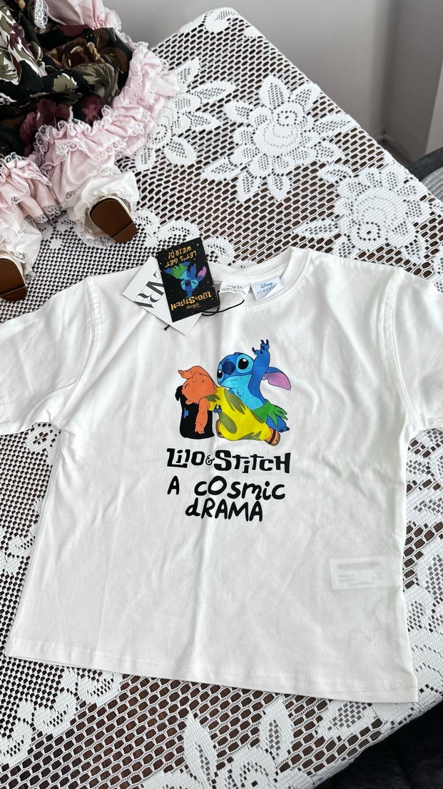 Pamuklu, beyaz, kısa kollu, dar kesim kız çocuk tişörtü. Lilo & Stitch renkli baskılı, 'A cosmic drama' yazılı. Velcro detaylı, sokak stiline uygun.