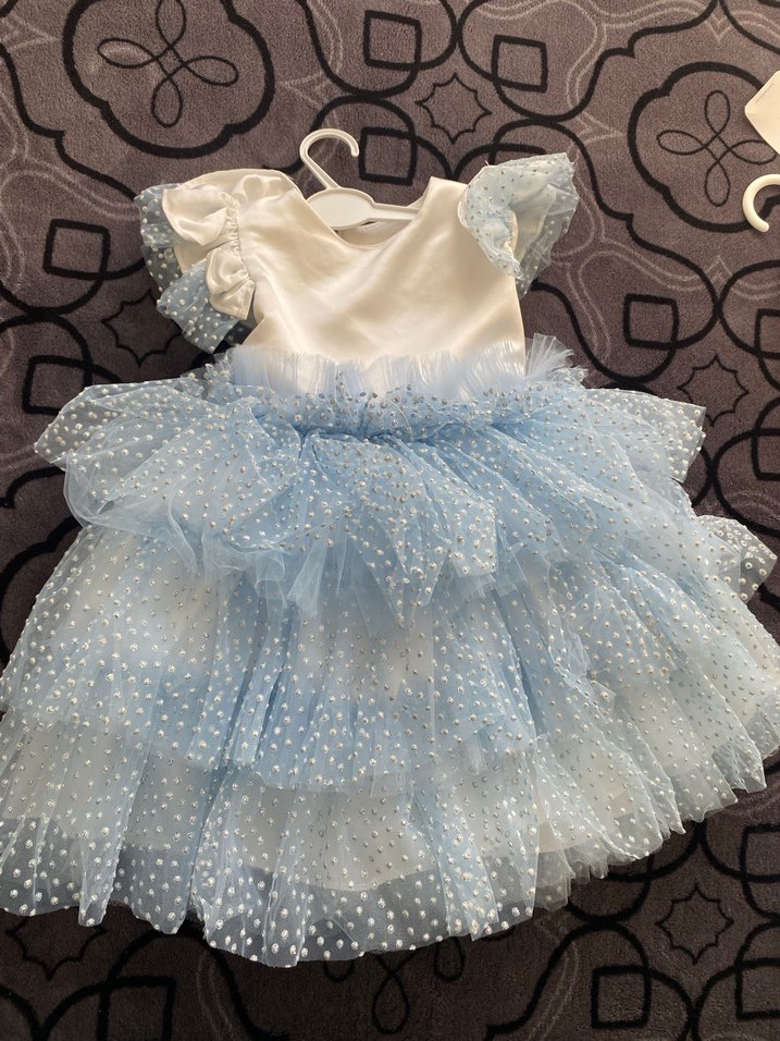 Kısa kollu, fırfırlı ve straplez yakalı kız çocuk elbisesi. Yumuşak sentetik kumaş, nakışlı pastel desenler ve kat kat mavi tül detaylarıyla bohem tarzda.hiç giyilmedi