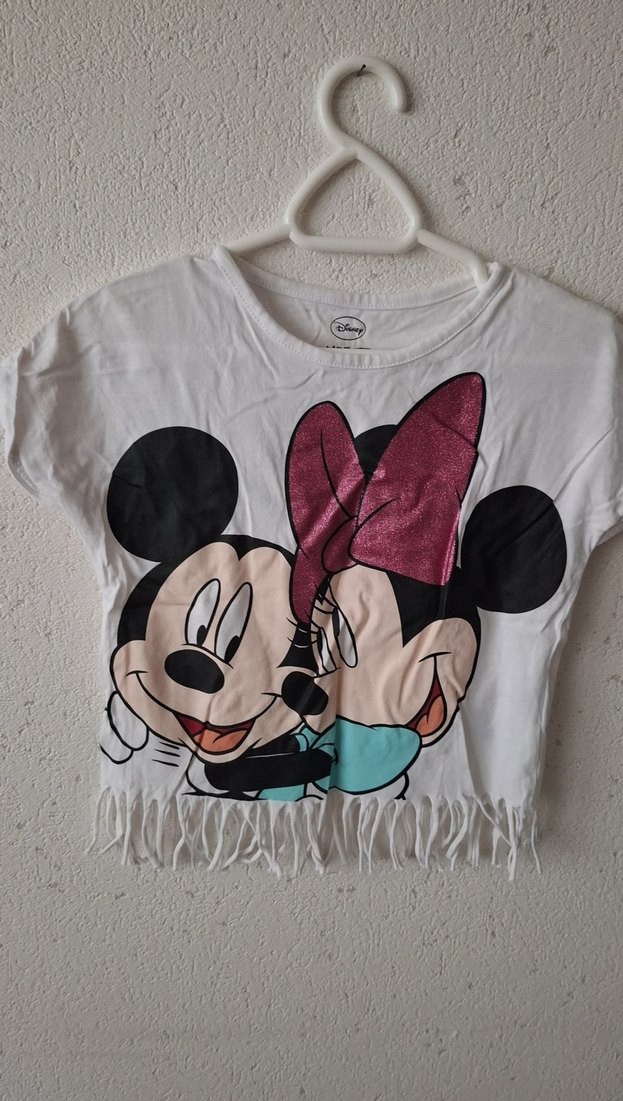 Pamuklu beyaz kız çocuk tişörtü, kısa kollu ve bol kesimdir. Mickey ve Minnie baskılı, simli fiyonk ve püsküllü detayları vardır. 98 cm