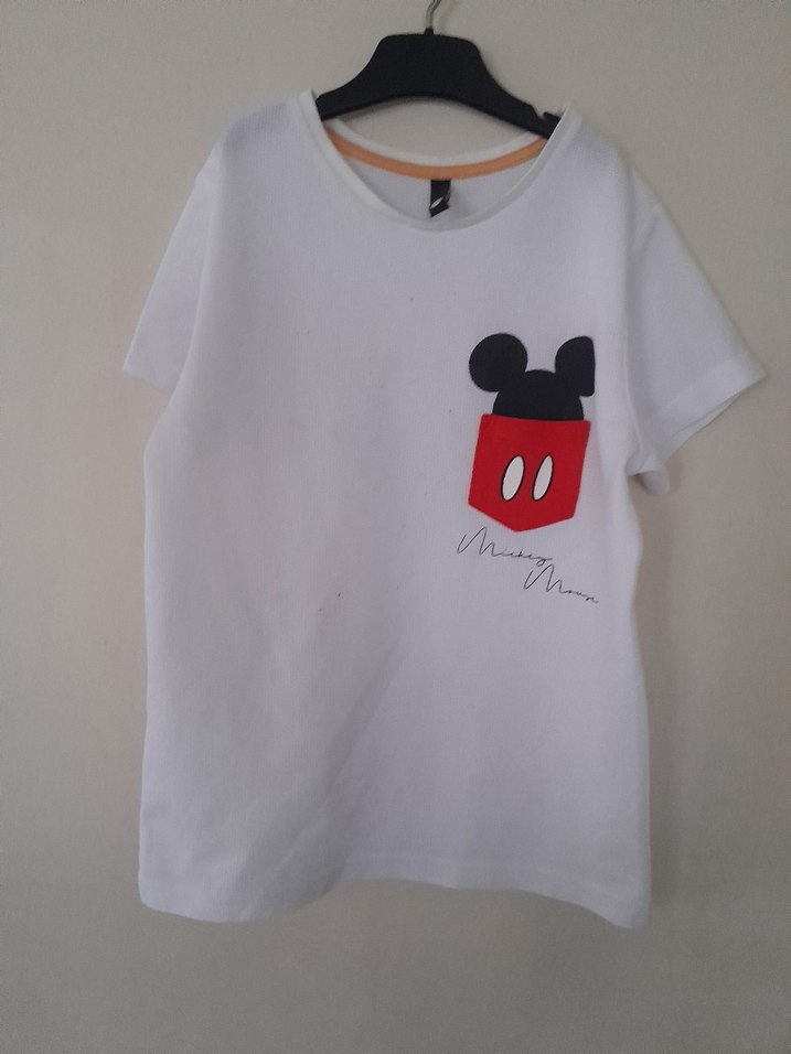 Pamuklu kumaştan yapılmış, kısa kollu ve yuvarlak yakalı beyaz kız çocuk tişörtü. Renkli Mickey Mouse baskısı ve düğme detayı ile rahat kesim sunar. kusurunu resimlere ekledim