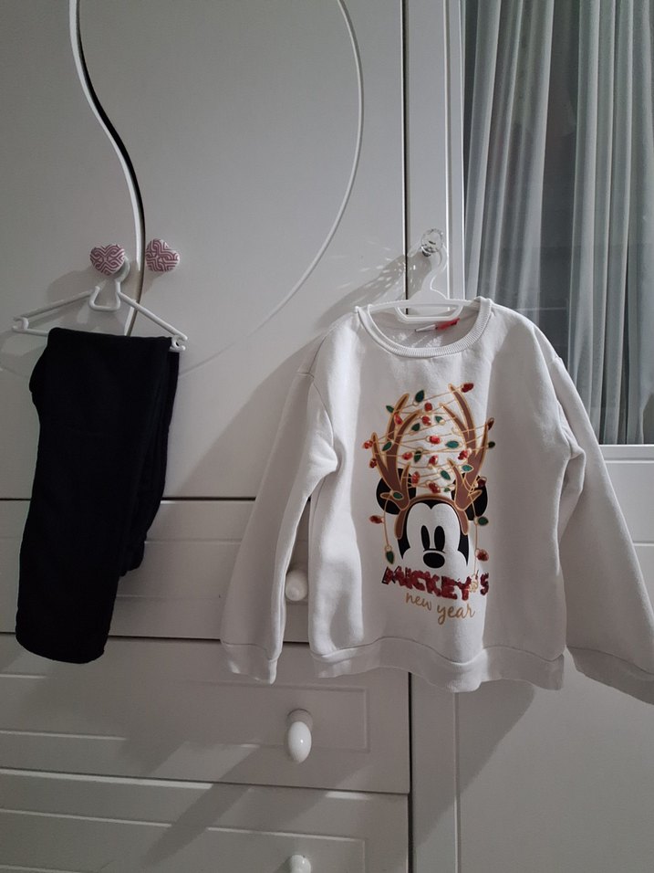 Kız çocuklar için beyaz, bol kesim, yuvarlak yaka ve uzun kollu sweatshirt. Örgü dokulu, yumuşak ve sıcak kumaş, renkli Mickey's baskılı. Trendy günlük kullanım için uygun. 4 takım 1000