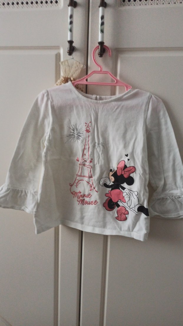 Beyaz, uzun kollu kız çocuk tişörtü, bol kesim ve volanlı kollarla. Yuvarlak yaka ve pastel Minnie Mouse baskılı desen içerir.