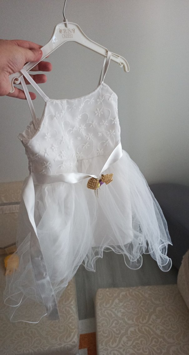 Beyaz nakışlı ve askılı, ince kemerli fiyonk detaylı, bohem tarzda kız çocuk elbisesi. Hafif ve şık görünür.