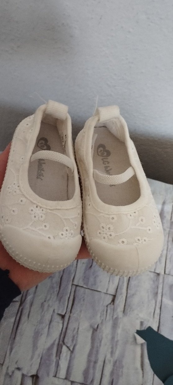 Nakışlı dantelli beyaz kız çocuk babetleri, lastik tabanlı, sade bohem tarzda ve pastel tonlarda. Lcw marka az gıyıldı