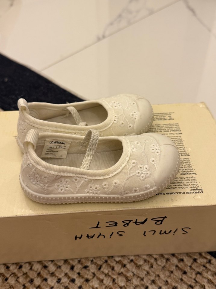 Kız çocuklar için beyaz nakış detaylı babetler, kolay kapanan cırt cırtlı bantla. Esnek kauçuk tabanlı, rahat ve klasik tasarımlı ayakkabılar.