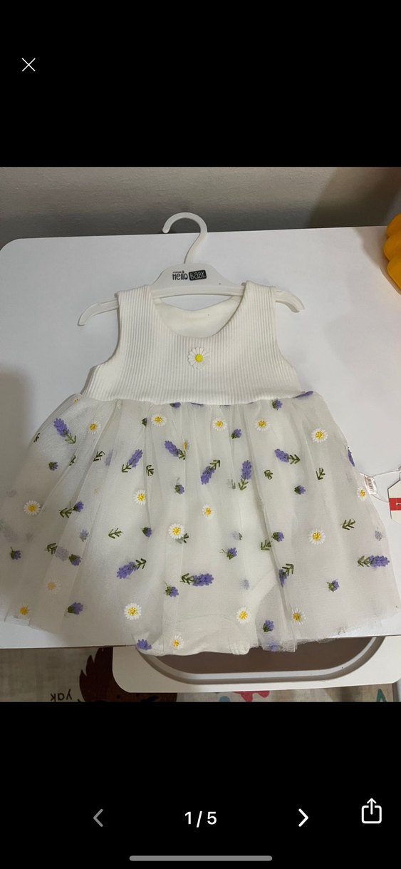 Kolsuz, askısız beyaz kız çocuk elbisesi, bol kesimdir. , nakışlı çiçek desenleri ve dantel detaylarıyla bohem tarzını yansıtır. Etiketli arka kısımda tül takıldı sanırım yırtılmış ama belli olmuyor ki istenirse iki kat tül var çiçekli tül kesilip bi alt kattaki sade tüllede kullanılır