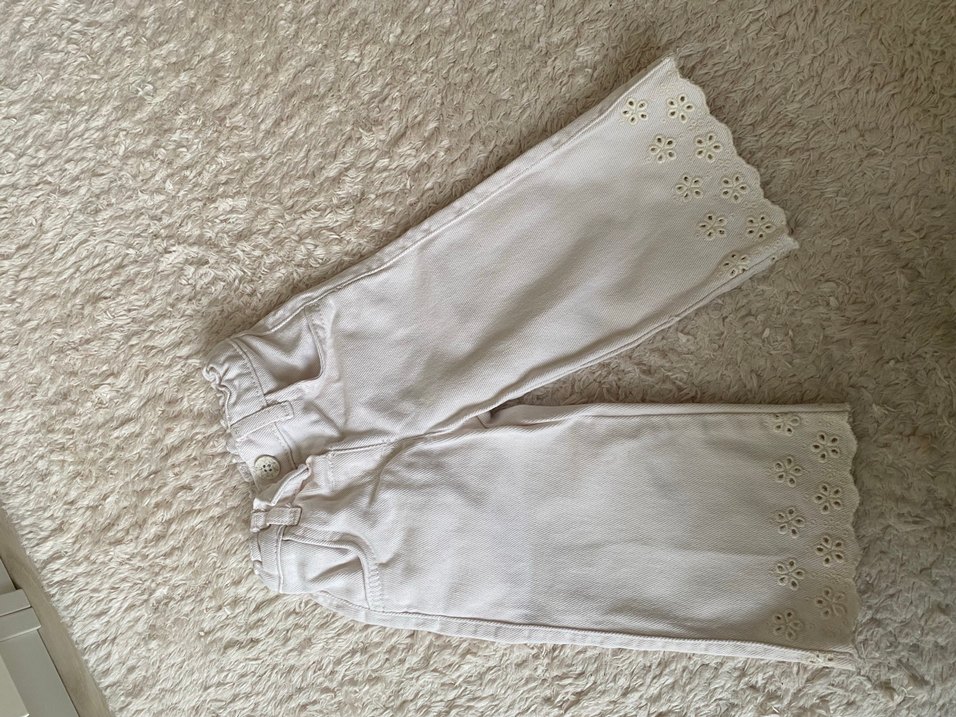 Nakışlı dantel detaylı, pamuk beyaz kız çocuk pantolonu. Rahat kalıp ve bohem tarzıyla şık bir görünüm sağlar.