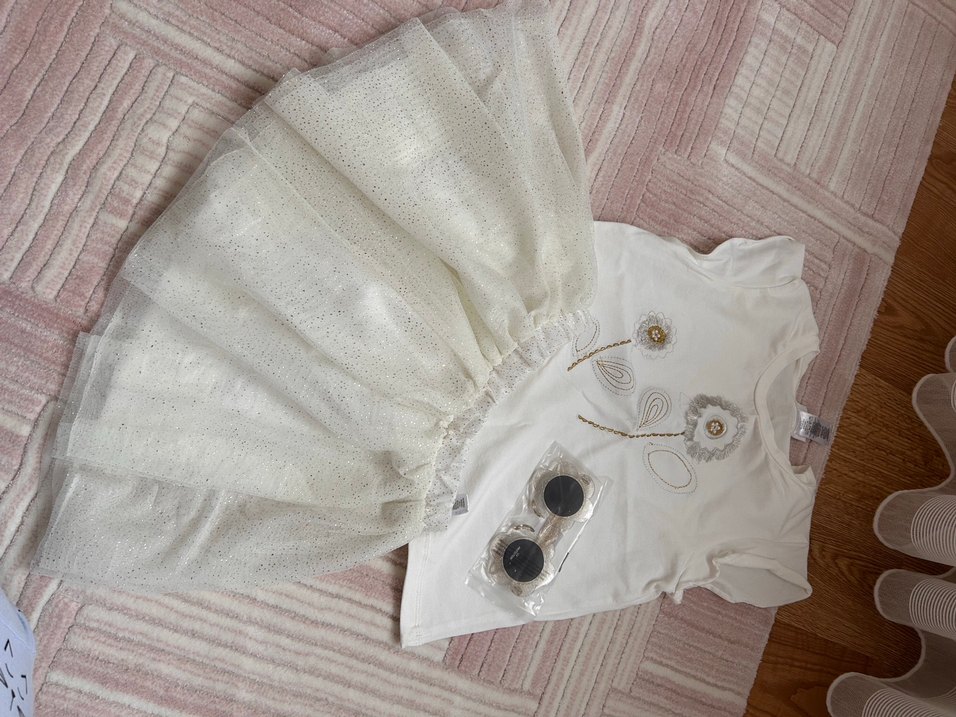 Beyaz renkli, dantel ve nakış detaylı kız çocuk elbisesi. Bol kesim, kısa kollu ve yuvarlak yaka tasarıma sahip, yumuşak sentetik kumaştan yapılmıştır.