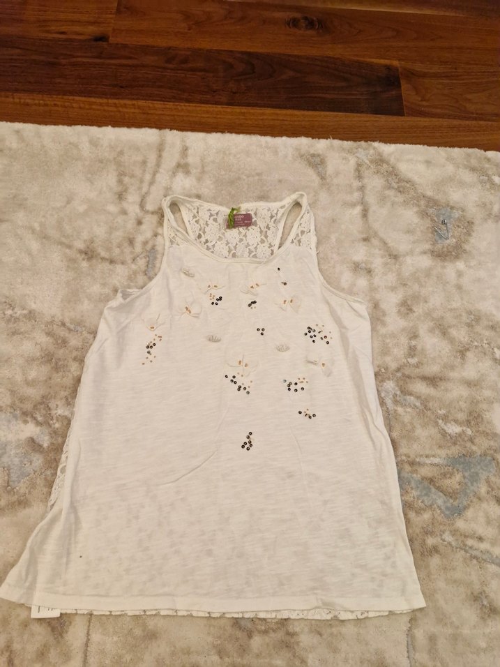 Beyaz renkli, dantelli ve nakışlı desenlere sahip, yuvarlak yaka ve ince örme kumaştan yapılmış bol kesim kız çocuk atleti.