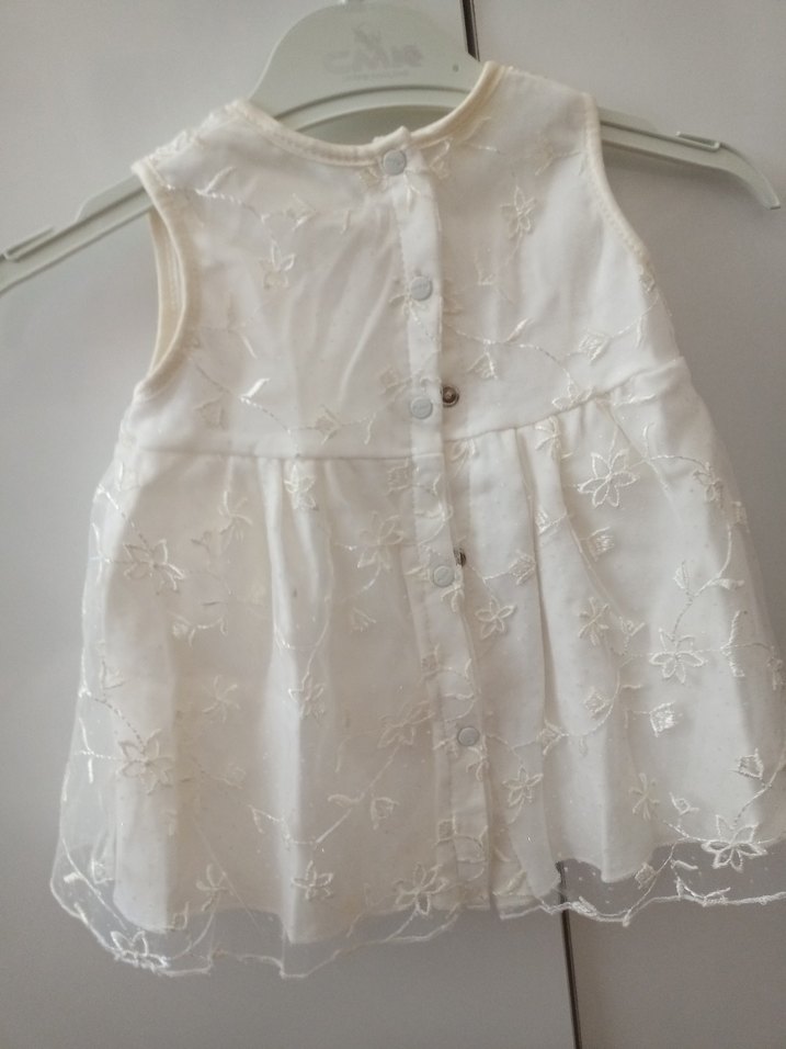 Kolsuz, beyaz nakışlı ve düğmeli arka kısmı olan kız çocuk elbisesi. Askısız yaka ve bol kesimle klasik bohem tarz sunar. Yumuşak sentetik kumaştan yapılmıştır.