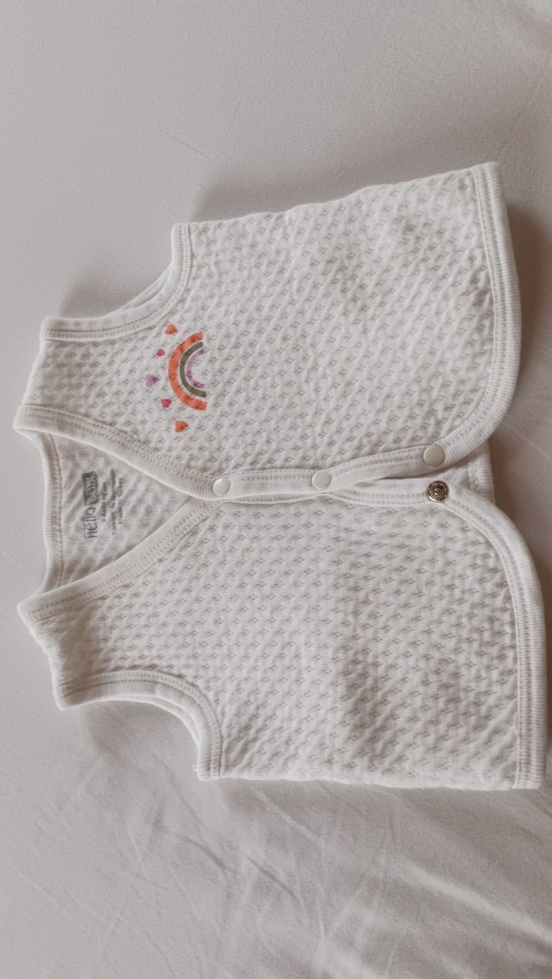 Beyaz, düğmeli, küçük gökkuşağı deseniyle kız çocuk yeleği. Kısa kollu, fitted kesim ve yumuşak, sıcak dokulu kumaştan yapılmıştır.