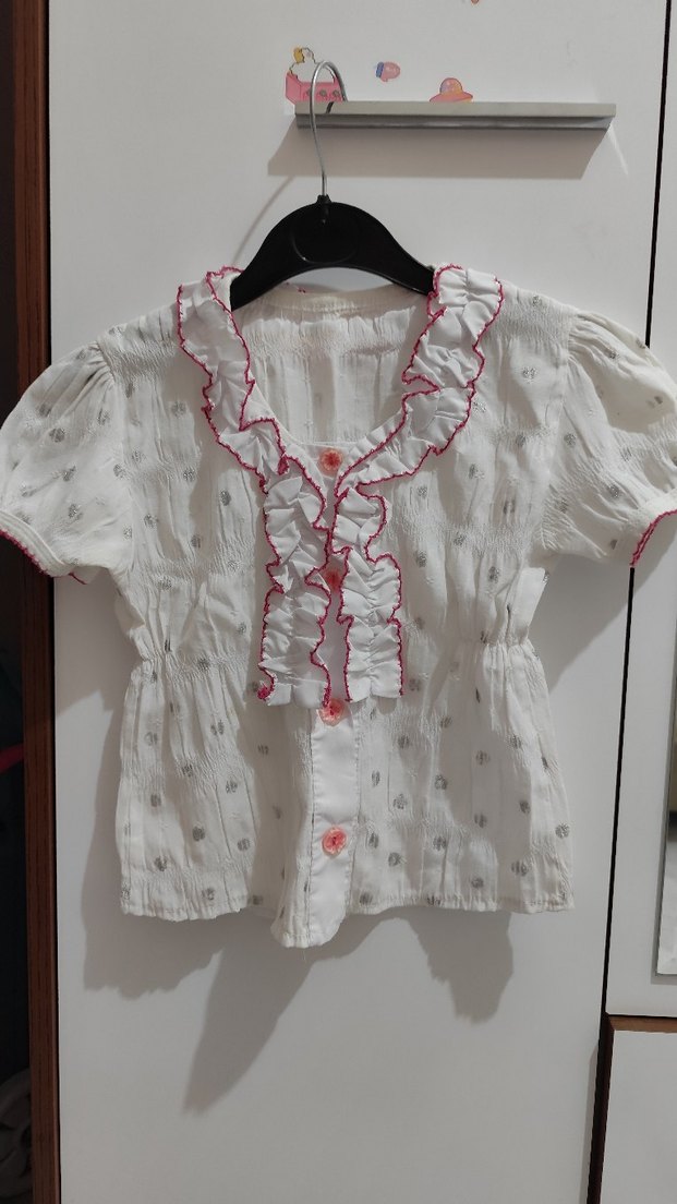 Pamuklu, kısa kollu, bol kesim beyaz bluz. V yaka ve pembe kenarlı fırfırlar, nakışlı detaylarla bohem tarz sunar. boy 40 en 28