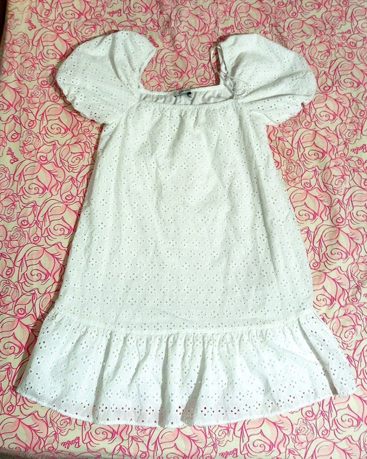artık gelmediği için satmak durumunda kaldığım ama çok severek giydiğim bir elbise. sadece bir kere giyildi. beyaz nakışlı, kısa balon kollu, kayık yaka elbise. Pamuklu yumuşak kumaştan, bol kesim ve fırfır detaylı bohem tarzda elbise.