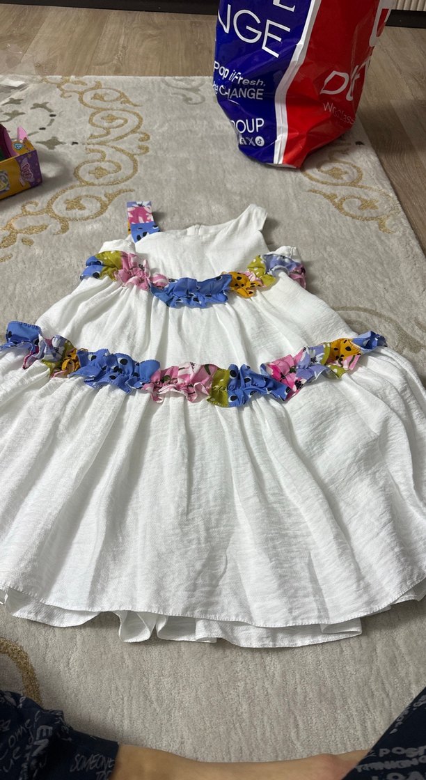 Nakışlı pastel renkli fırfır detaylı, askılı ve bol kesim beyaz kız çocuk elbisesi. "OUP" yazısı bulunur.
