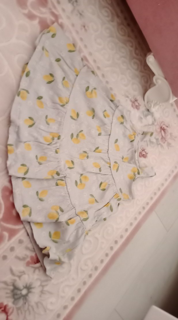 Beyaz nakışlı ve fırfırlı kız çocuk elbisesi. Yumuşak sentetik kumaştan, kapüşonlu ve askılı tasarıma sahip, bol kesim. Pastel renkler içerir.