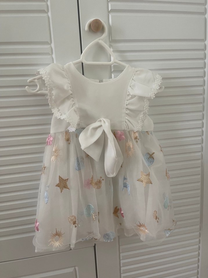 Kolsuz, beyaz fırfırlı detaylı kız çocuk elbisesi. 6-9 ay ve bence 1 yaş için de uygundur.
