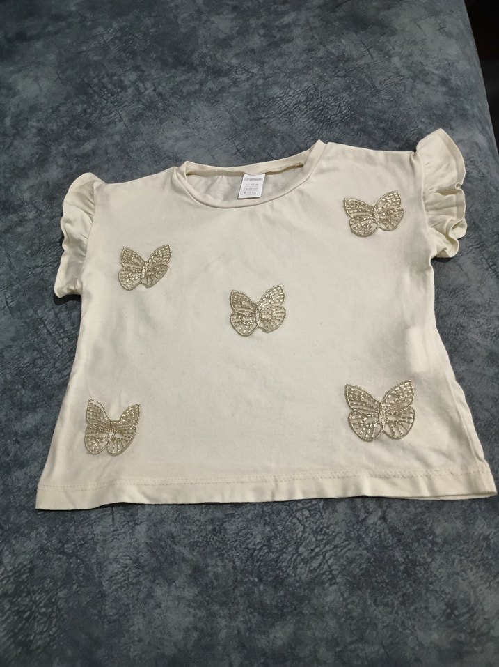 Beyaz, bol kesim kız çocuk tişörtü, kısa kollu ve fırfırlı detaylıdır. Nakışlı kelebek desenleri ve yuvarlak yaka bulunur. Yumuşak sentetik kumaştan üretilmiştir.