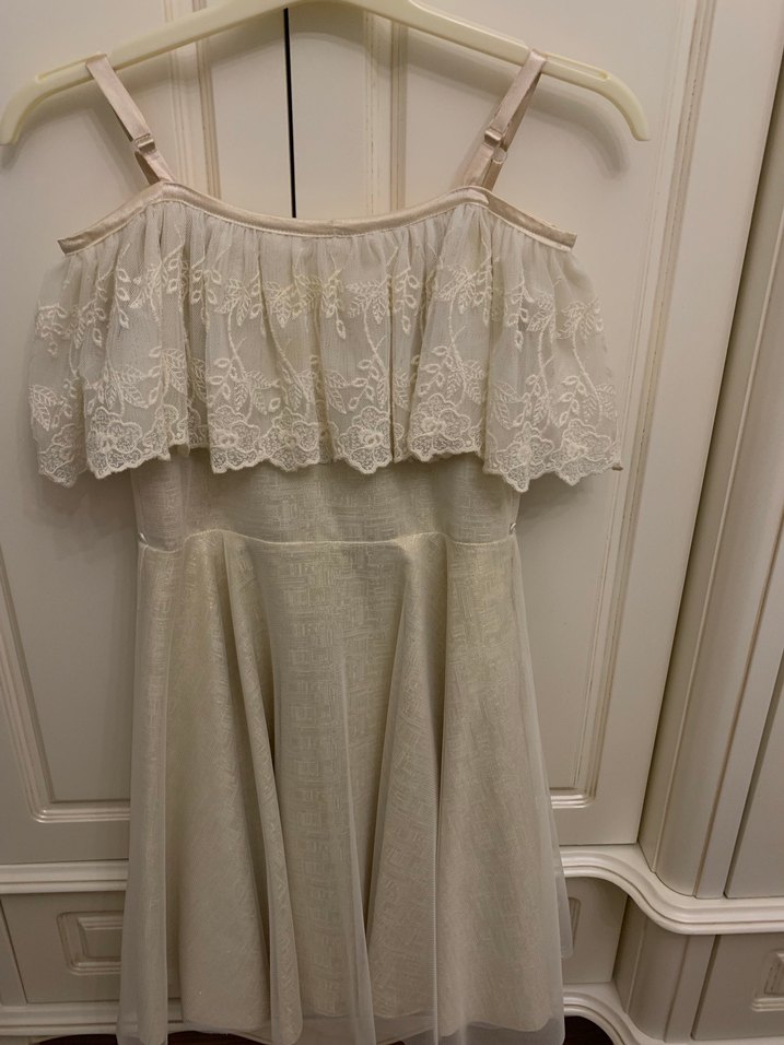 Kolsuz ve straplez beyaz elbise, nakışlı fırfır detayları ve bol kesimiyle keten kumaştan, bohem tarzda tasarlanmıştır.