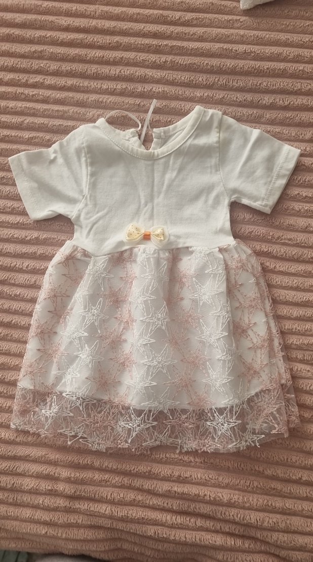 Kız çocuk elbisesi, kısa kollu ve yuvarlak yakalıdır. Yumuşak sentetik kumaştan yapılmış, bol kesim ve pastel beyaz renkte. Nakışlı dantel detayları ve belde küçük bir fiyonk bulunur.