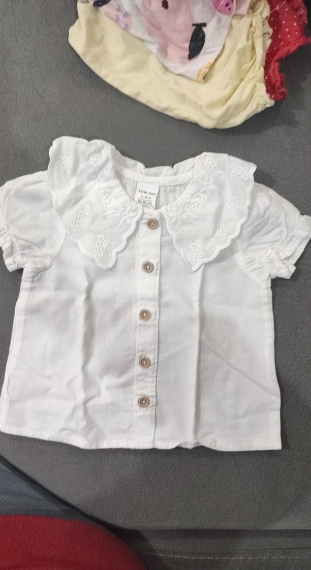 Pamuklu, beyaz renkli kız çocuk gömleği, nakışlı yakası ve düğmeli önü ile dikkat çeker. Kısa kollu ve bol kesimdir.