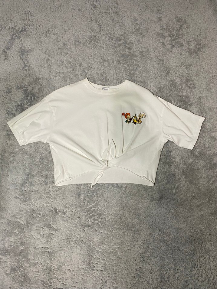 Beyaz renkli, nakış detaylı, düğmeli kısa kollu kız çocuk tişörtü. Pamuklu kumaştan, bol kesim ve bisiklet yaka ile rahat bir tasarım sunar.