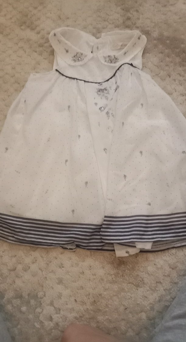 Nakışlı desenler, fırfır ve tekne yaka detaylı beyaz kolsuz kız çocuk elbisesi. Gri çizgili etek ucu ve bol kesimiyle bohem tarzını yansıtıyor.