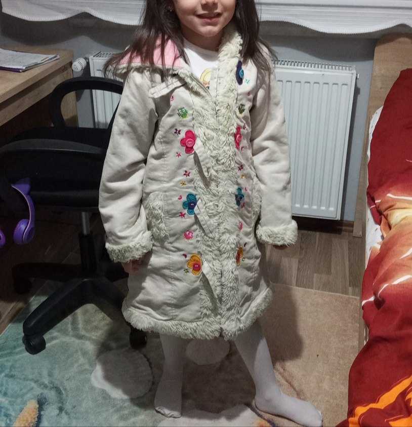 Beyaz renk, nakışlı ve kürk detaylı, kesimi vücuda oturan, notched lapel yaka model kız çocuk montu. Yumuşak ve sıcak kumaş, sokak modasına uygun 7-8-9 yaş uyumlu.