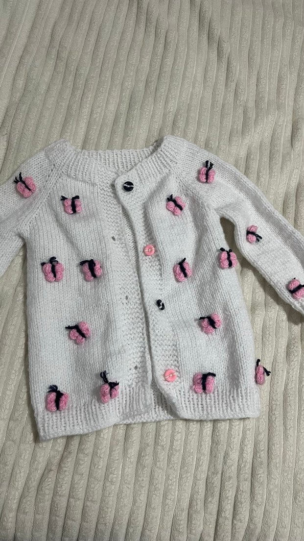 Kız çocukları için beyaz, uzun kollu, nakışlı pembe detaylara sahip örgü hırka. Rahat ve bol kesim, sokak stiline uygun.