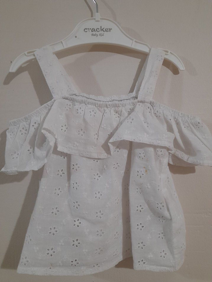 Beyaz, askılı ve fırfırlı kız çocuk bluz, nakışlı desenli ve pamuklu yumuşak kumaştan. Bol kesim ve bohem tarzda.