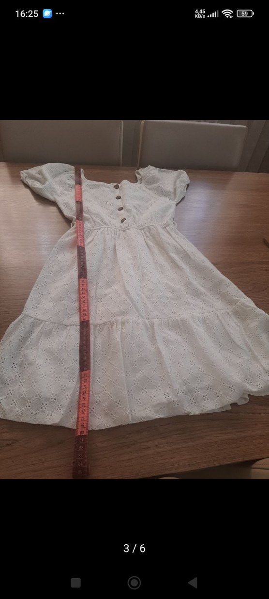 Pamuk beyaz elbise, V yakalı, kısa kollu, bol kesim. Nakışlı desenleri ve fırfırlı detaylarıyla bohem tarzı yansıtıyor.