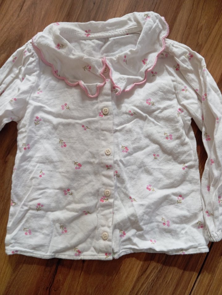 Uzun kollu, yakalı ve düğmeli beyaz pamuk gömlek. Pastel renklerde nakış desenleri ve bol kesimi vardır.