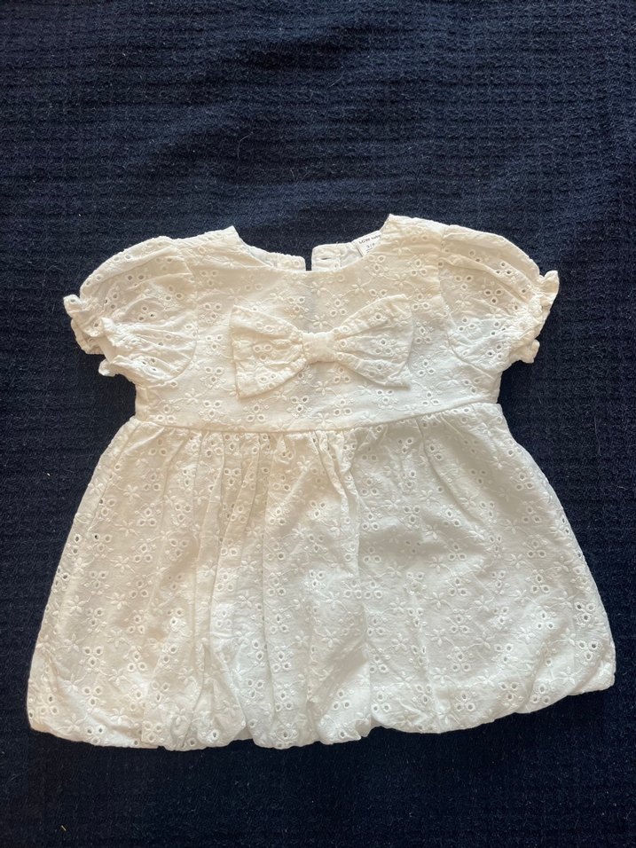 Kısa fırfırlı kollara, nakışlı desene ve yuvarlak yakaya sahip, bol kesim beyaz pamuklu kız çocuk elbisesi. Göğüs kısmında büyük fiyonk detayı bulunur.