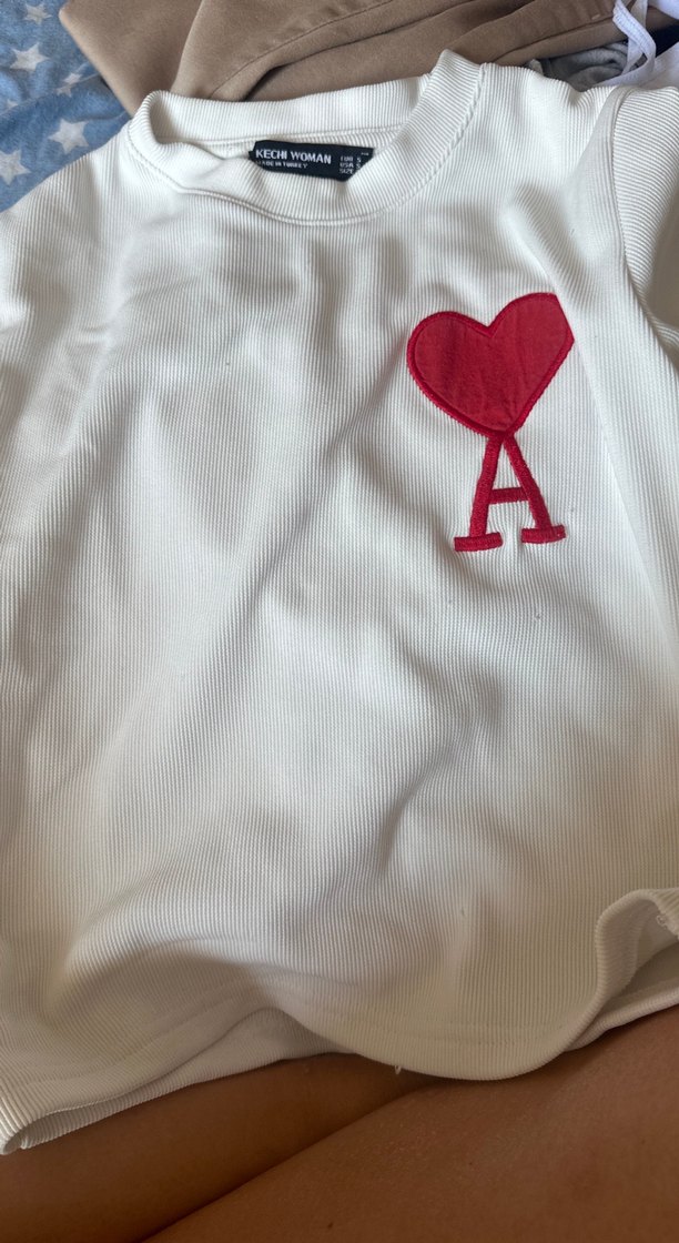 Kız çocukları için beyaz , kısa kollu, yuvarlak yakalı, kırmızı kalp ve 'A' harfi nakışlı, düğmeli, crop kesim tişört. ❤️
