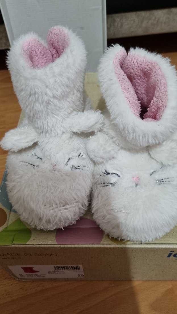 Kız çocukları için beyaz, peluş detaylı ve nakışlı desenli, içi pastel pembe yumuşak astarlı sıcak terlikler.