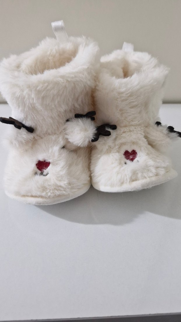 Kız çocukları için beyaz renkte, yumuşak peluş detaylı ve renkli nakışlı desenlere sahip sıcak ev terliği. Sokak stiline uygun sade tasarım. o ayarında