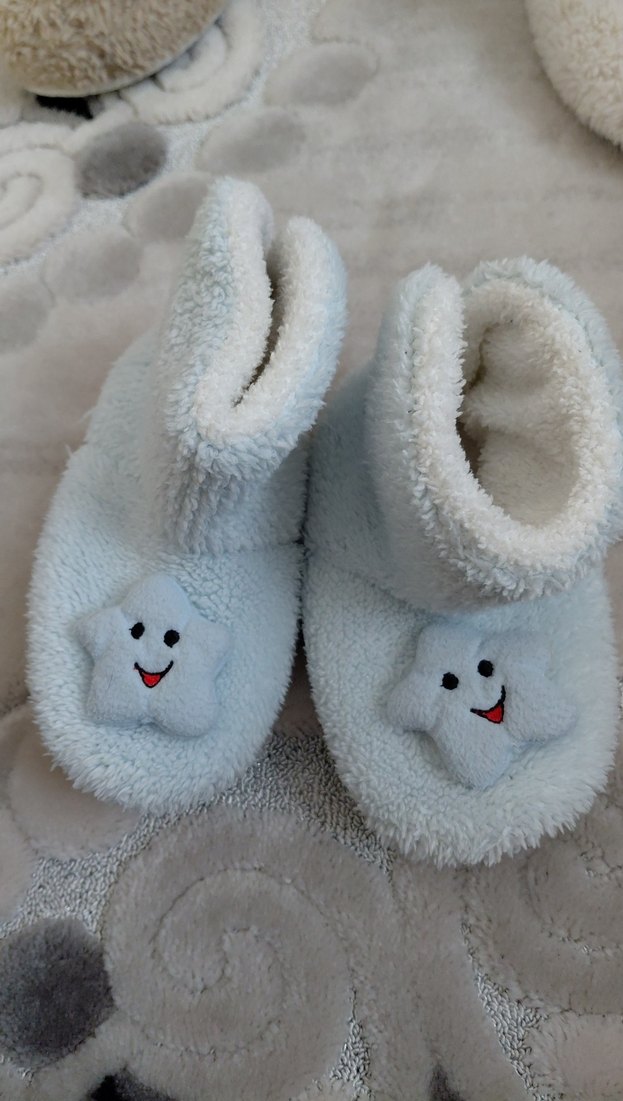 Yumuşak beyaz kumaştan, örgü detaylı ve renkli nakışlı gülen yıldız desenli kız çocuk ev terliği. Sıcak ve rahat kullanıma uygun. ⭐