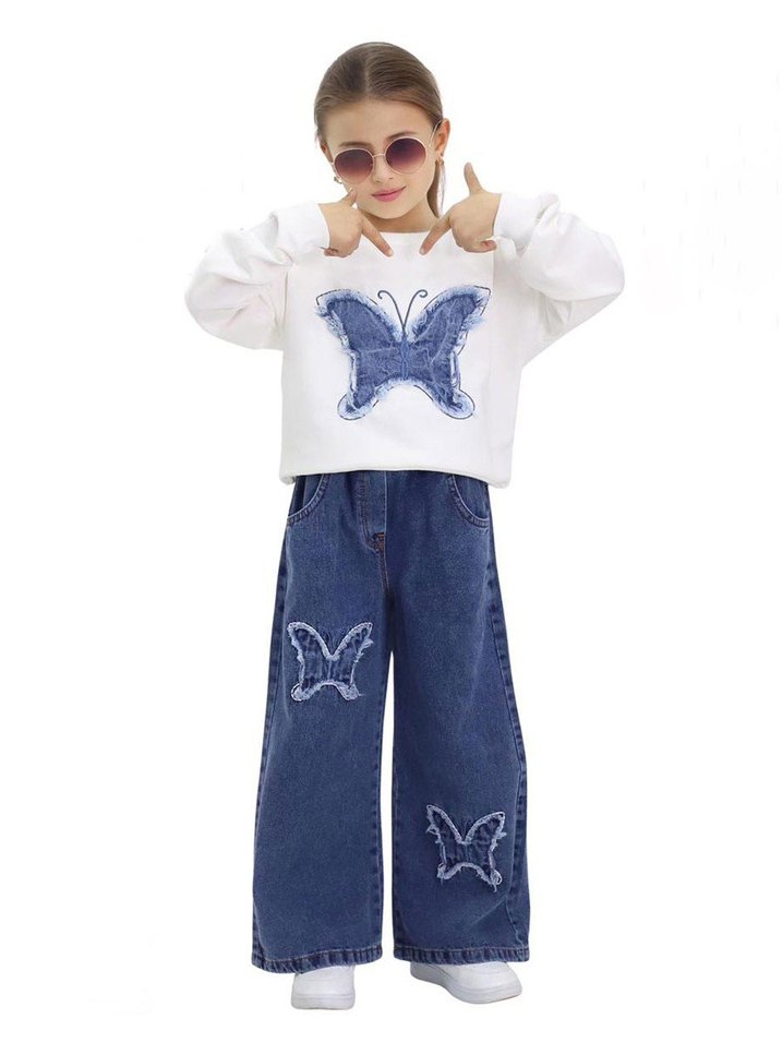 Geniş kesim kız çocuk beyaz nakışlı örme sweatshirt ve kot pantolon takımı. Casual sokak stili için uygun.