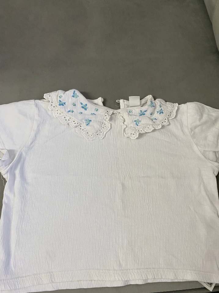 Kız çocuk için beyaz nakışlı fırfırlı yakaya ve kısa kollara sahiptir. Salaş kesim, sokak stili için uygundur.