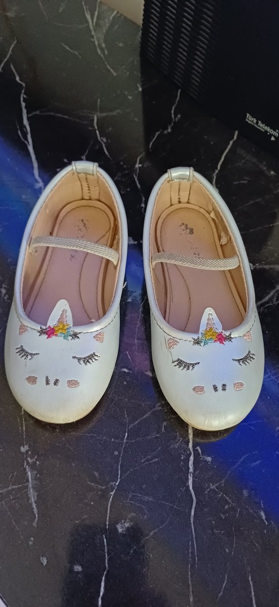 Beyaz renkli, nakışlı unicorn desenli kız çocuk babetleri. Tokalı kayış ile desteklenmiş, dayanıklı kauçuk malzemeden yapılmıştır.