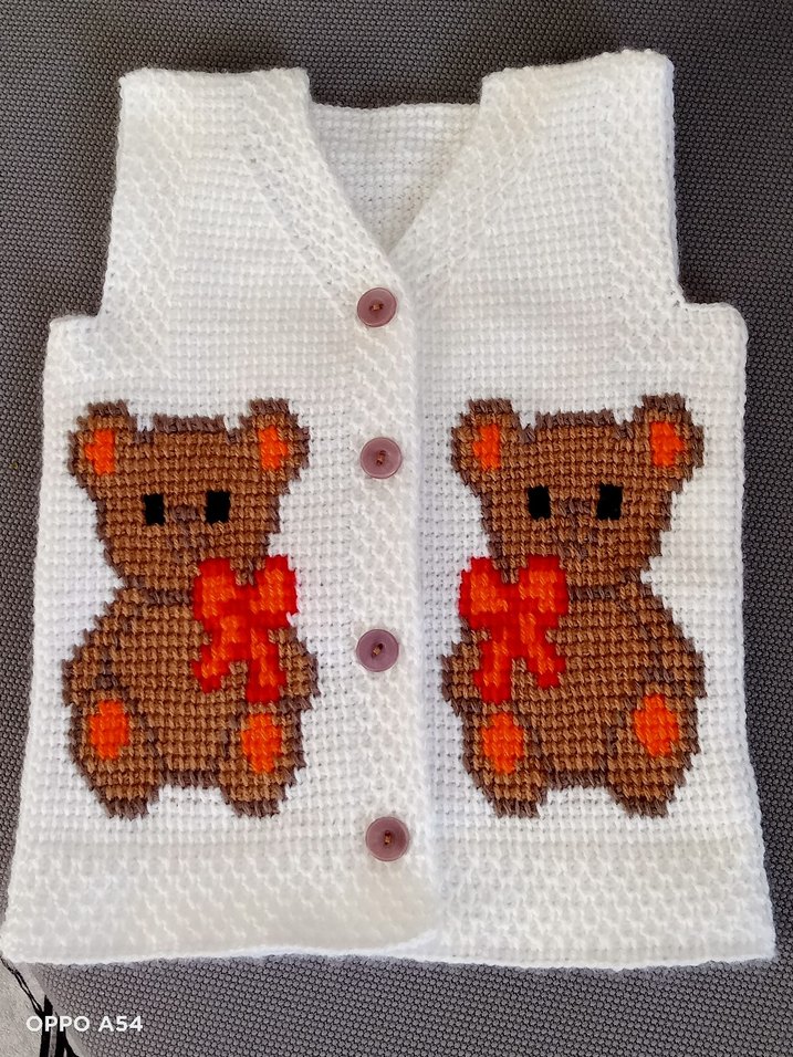 Düğmeli, V yakalı, beyaz triko yelek, önünde kırmızı fiyonk detaylı kahverengi nakış ayıcıklar bulunur. Kız çocuklar için uygundur. Tunus işi tekniği ile örülmüştür, sıfır üründür Eni 25 cm, boyu 33 cm'dir.