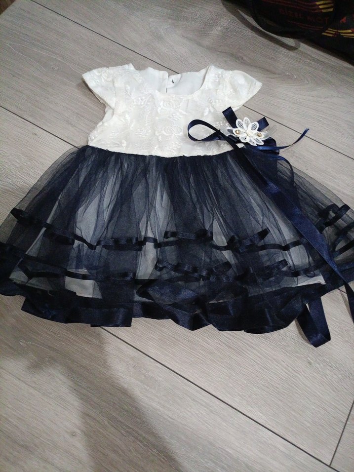 Nakışlı beyaz üst ve kat kat koyu tül etek ile süslenmiş, kısa kollu kız çocuk elbisesi.