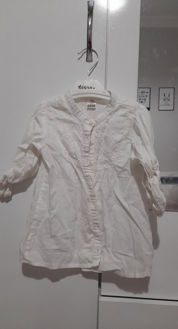 Beyaz kız çocuk gömlek, uzun kollu, yakalı ve düğmeli. Yumuşak keten kumaştan, bol kesim ve zarif nakış detaylarıyla bohem tarz sunar.