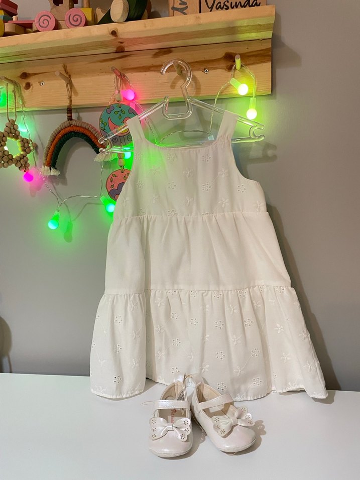 ebebekten alındı bebbek marka 1,5 yaş ama biz 2 yaşta da giydik 2 kez giyildi toplamda temiz kusursuz pamuk kumaş özel gün elbisesi astarlı iç göstermez Kolsuz, nakışlı beyaz pamuk elbise, volan detaylı ve bol kesimdir, sade bohem tarz sunar.