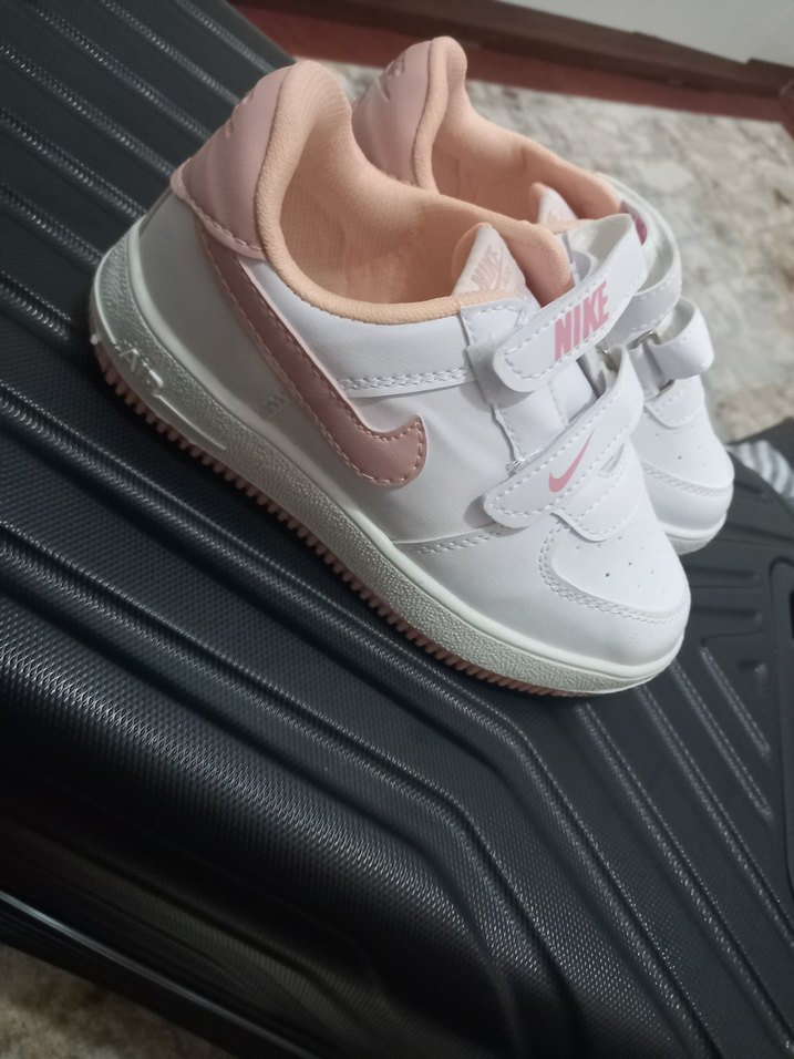Kız çocuklar için beyaz Nike spor ayakkabı, açık pembe iç detayları ve kolay giyilen cırt cırtlı bantlarla. Kauçuk taban dayanıklı ve rahat, günlük sokak stili için uygundur.