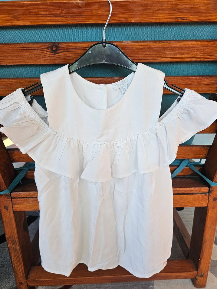 Beyaz pamuklu bluz, omuz açık fırfırlı detaylarla kısa kollu ve bol kesimdir. Minimalist ve bohem tarzda, günlük kullanıma uygundur.