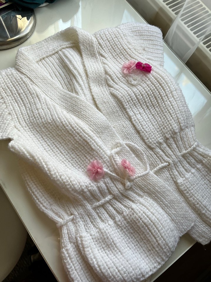 Kız çocukları için beyaz örme, kolsuz, bol kesim ve pembe çiçek detaylı bohem tarzda yelek. Çok az kullanıldı görüldüğü gibi