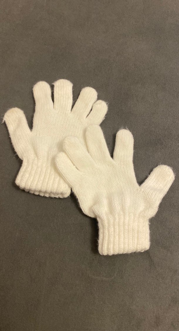 Kız çocukları için beyaz, örgü eldivenler. Düz, desensiz ve yumuşak örme kumaştan üretilmiştir.