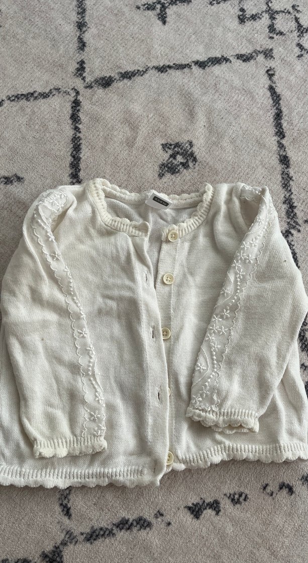 Kız çocuk için uzun kollu, bol kesim beyaz örgü hırka. Kollarında ince dantel detayları bulunan bohem tarzda, yumuşak ve rahat örme kumaş.