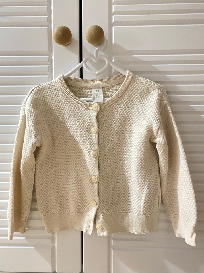 Kız çocuk için beyaz, örgü kumaştan yapılmış, uzun kollu hırka, desensiz sade tasarıma sahiptir. H&M 12-18 ay . Daha küçük aylarda da kullanılabilir . %100 pamuk