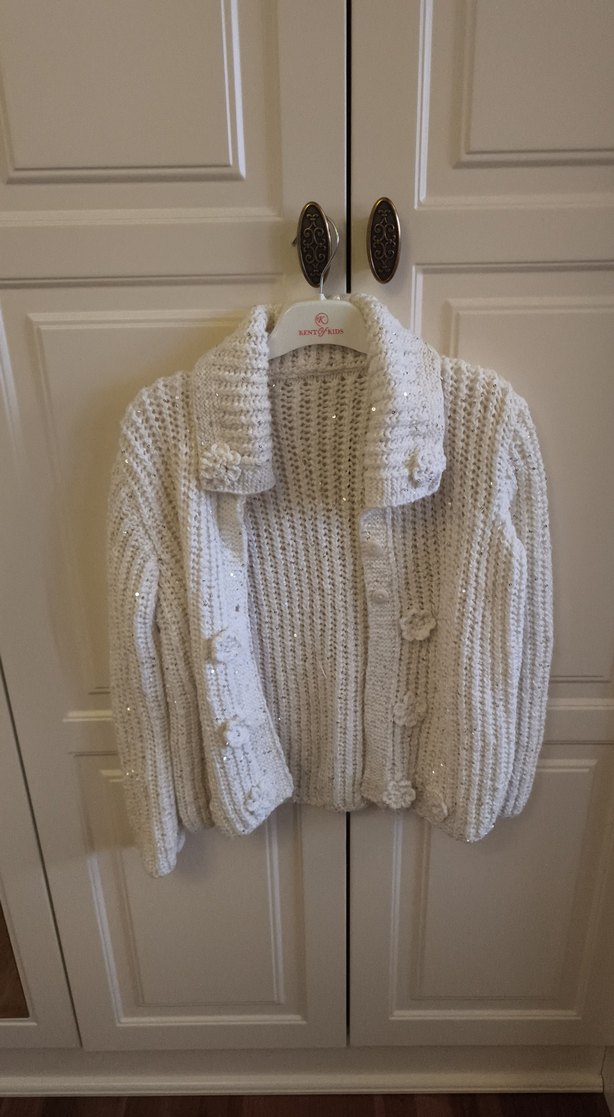 Beyaz renkli, uzun kollu, bol kesim kız çocuk örgü hırka.El örgüsü pullu ekru ipten örüldü hiç gityilmedi 9-10 yaşa uygun